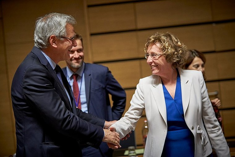 Photo: La ministre française du Travail Muriel Pénicaud, et son homologue belge, Kris Peeters. Crédit PHOTO : Conseil européen