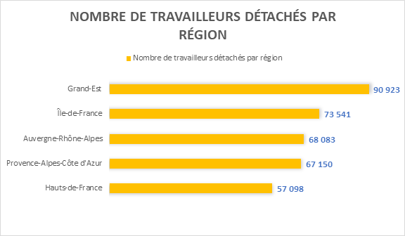 Les régions frontalières sont celles qui accueils le plus de salariés détachés, dont en première position la région Grand-Est (90 923 travailleurs détachés déclarés en 2017), suivi de la région Île-de-France (73 541) puis en troisième position, la région Auvergne-Rhône-Alpes (68 083). Nous retrouvons respectivement, à la quatrième et cinquième place, les régions PACA et Hauts-de-France.